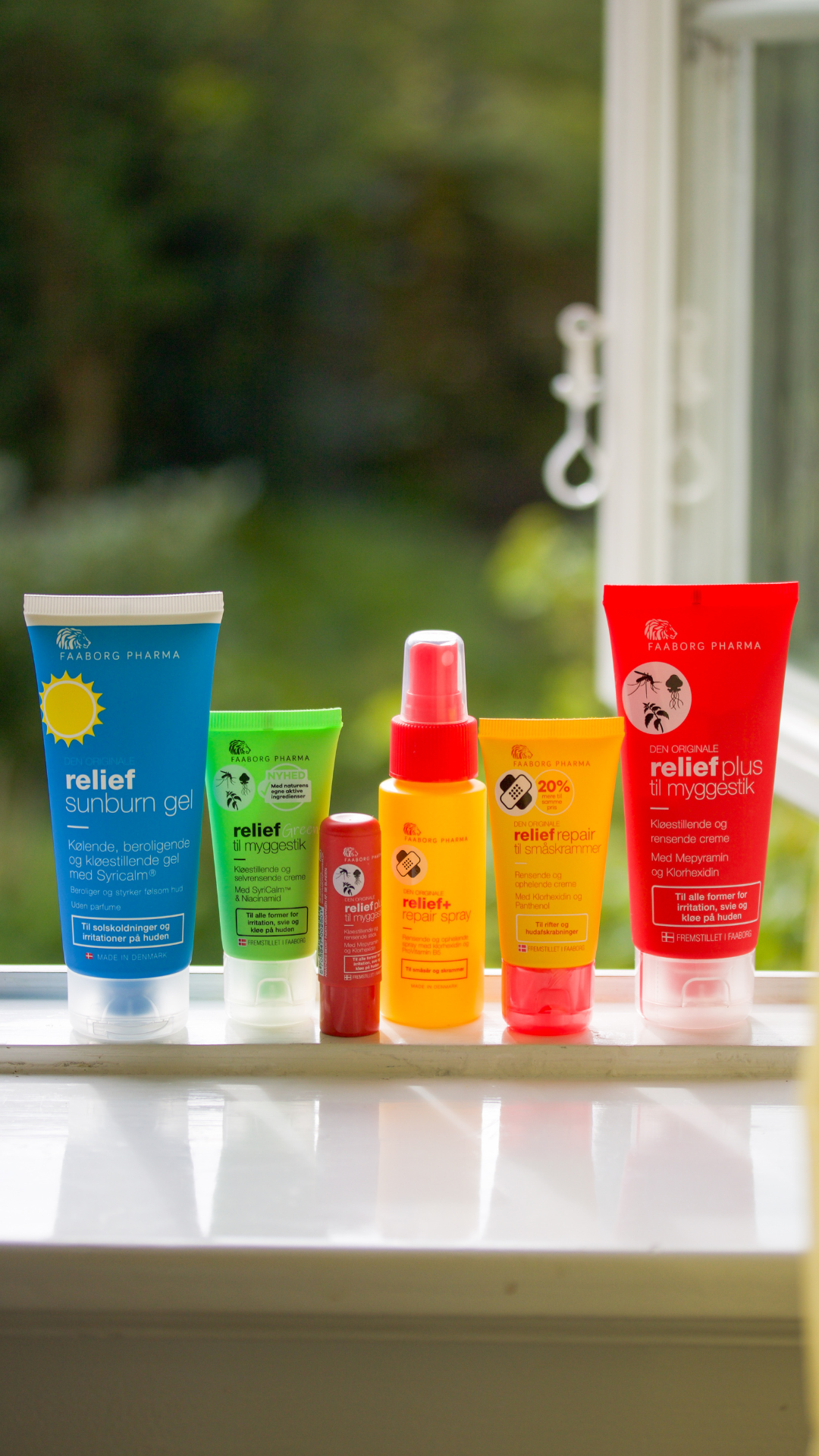 Relief-serien är en lindrande första hjälpen-serie som kan hjälpa till att hantera olika hudtillstånd. Produkterna kan lindra besvär efter bland annat insektsbett, maneter, skrubbsår och solbränna. Flera av produkterna innehåller klorhexidin, som har en rengörande effekt, vilket gör dem lämpliga att ha med där det inte finns tillgång till vatten och tvål. Hela relief-serien är formulerad med naturliga ingredienser och är fri från parabener, sulfater, parfym och andra skadliga kemikalier. Därför är de lämpliga för alla hudtyper och kan användas dagligen för att ge lindring och näring till huden.